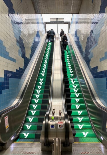 A intervenção começa nas escadas rolantes: uma linha verde acompanha quem escolhe o lado esquerdo — o caminho rápido.